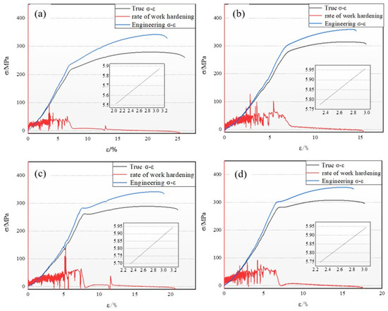 When analyzing the stress–strain behavior of magnesium alloys, the relationship between the engineering stress–strain curve and the true stress–strain curve is crucial. Figure 6a–d show the engineering stress–strain curve and the true stress–strain curve for each sample at room temperature. As shown in the figures, the two curves are closely aligned in the initial stage, and then the true stress begins to significantly exceed the engineering stress. This difference is due to the fact that the true stress takes into account the reduction in the cross-sectional area caused by material necking, while this is not considered in the engineering stress. The rate of the work-hardening curve provides information about the rate of the hardening process.