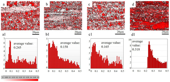 Basal Schmid factor distributions measured by EBSD for as-extruded alloys: (a,a1) ZMX310; (b,b1) ZTX310; (c,c1) ZMXE3101; (d,d1) ZTXE3101.