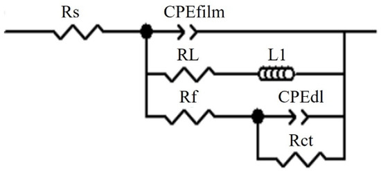 The corrosion characteristics of the extruded magnesium alloys in the NaCl solution were measured through EIS testing. Figure 8 shows the Nyquist and Bode plots of the four alloys. From Figure 8b, it can be seen that the Nyquist curves of the four alloys have similar shapes, indicating that a single type of circuit diagram can explain the impedance behavior of the double layers and surface films of all alloys. The equivalent electrical circuit (EEC) is shown in Figure 9. It is found that the high-frequency capacitance loop size is in the order of ZTX310 < ZMX310 < ZTXE3101 < ZMXE3101, indicating that ZMXE3101 has the best corrosion resistance, which is also consistent with the analysis of the polarization curve. As shown in Figure 8d, the higher impedance range of ZMXE3101 occurs at frequencies larger than 1 Hz.