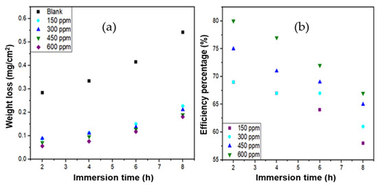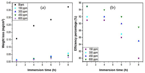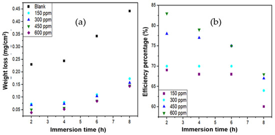 - The weight loss method reveals that Ruta graveolens extract significantly decreases the corrosion rate of 304 steel, obtaining a maximum inhibition efficiency of 95.28% at 25 °C and 600 ppm extract. Conversely, as the temperature and immersion time increase, the inhibition efficiency decreases.