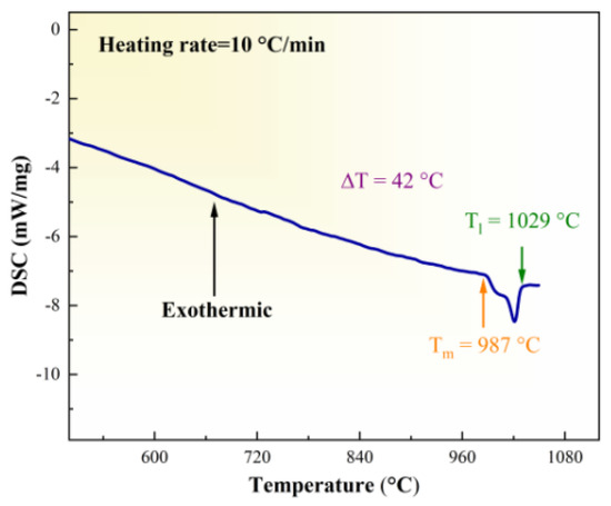 In this paper, GH4169 alloy was the base metal (BM), and its composition is listed in Table 1. To facilitate obtaining samples for microstructure analysis and shear testing, the GH4169 bar was cut into cubic specimens with dimensions of 4 mm × 4 mm × 4 mm and 10 mm × 10 mm × 4 mm. Among them, brazed samples in 4 mm × 4 mm × 4 mm blocks were used for microstructure analysis, and brazed samples using blocks in 4 mm × 4 mm × 4 mm and 10 mm × 10 mm × 4 mm sizes were used for shear tests. The contact surface was ground using 1500 grit silicon carbide paper, then ultrasonically cleaned in ethanol for 6 min before brazing. JNi-5 amorphous foil was used as the filler metal, and its composition is listed in Table 1. This filler metal was prepared using the rapid solidification technique. Its width is about 4 mm, and its thickness is about 50 μm. The thermal properties of this filler metal were characterized by the differential thermal analysis (DTA) device at a heating rate of 10 °C/min as shown in Figure 1. The melting temperature (Tm) is 987 °C, and the liquidus temperature (Tl) is 1029 °C. The JNi-5 filler metal developed in this study is similar to the BNi-4 brazing alloy in the literature [30], both exhibiting the characteristic of a low liquid temperature.
