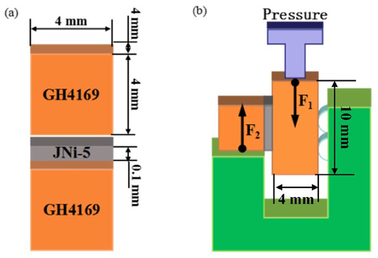 After grinding and polishing, the microstructure and quantitative composition analysis of brazed joints were examined by scanning electron microscopy (SEM) equipped with an energy dispersive spectroscopy (EDS). Phase identification was carried out by the X-ray diffractometer (XRD). Hardness distributions across the brazed region were measured by a digital microhardness tester at a load of 50 g for 10 s. The shear test was conducted by a universal test machine with a cross-head speed of 0.5 mm/min, and this test is shown in Figure 2b. Fracture morphologies of joints were characterized by scanning electron microscopy and confocal microscopy.