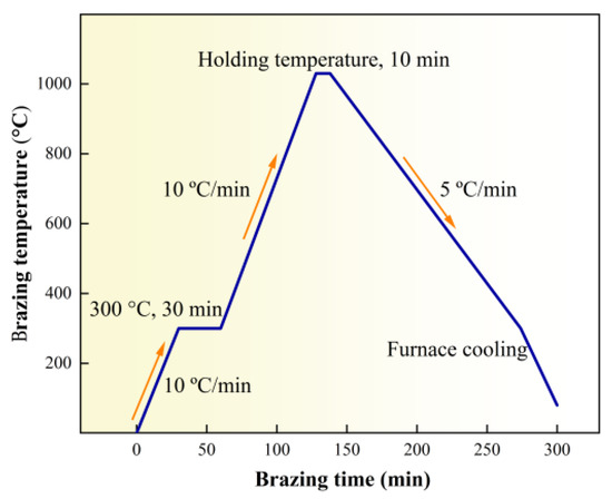 Specimens and filler metal were assembled as a sandwich structure in Figure 2a. The brazing experiments were carried out under a vacuum of 8 × 10−3 Pa. Figure 3 shows the brazing process: the combined specimens, pressured using a Mo block, were first heated up to 300 °C at 10 °C/min and held for 30 min. Then the assemblies were heated further up to the target brazing temperature (1030 °C, 1060 °C, 1090 °C, and 1120 °C) at a rate of 10 °C/min and held for 10 min. After that, all these bonded specimens were cooled to 300 °C at a rate of 5 °C/min. Finally, specimens were cooled in the furnace to room temperature.