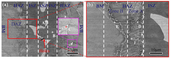 Figure 4 shows the typical microstructure and heat-affected zone of the obtained joint brazed at 1030 °C. Based on the distribution features of phases, the microstructure could be divided into four specific zones: base metal, heat-affected zone, isothermal solidification zone, and athermal solidification zone.
