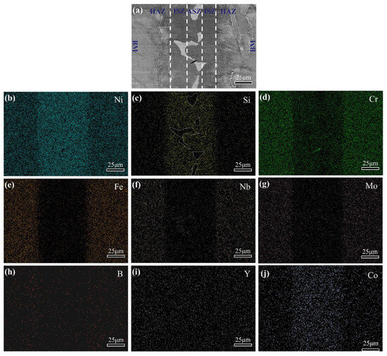 Typical microstructure and element distributions of the joint brazed at 1030 °C: (a) typical microstructure; (b) Si; (c) Ni; (d) Cr; (e) Fe; (f) Nb; (g) Mo; (h) B; (i) Y; (j) Co.