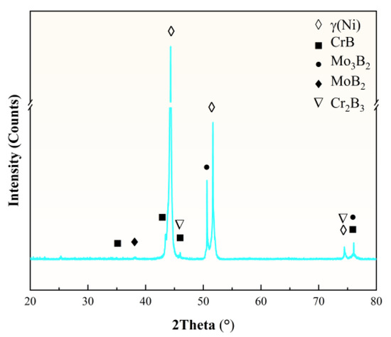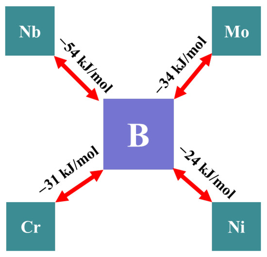 In order to identify the phases in the joint, the fracture of the joint at 1030 °C was characterized by XRD, and the XRD pattern is shown in Figure 6. It could be observed that the GH4169 joint contains γ(Ni), CrB, Ni3B, Cr2B3, and Mo3B2. The joint mainly contains six specific phases, and these phases were marked using A, B, C, D, E, and F, as shown in Figure 4. Table 2 displays the chemical compositions (at. %) of the marked points analyzed by EDS. Phase A is distributed in the ASZ, and the EDS results indicate that the chemical composition of phase A is 77.29% Ni, 8.86% Cr, and 1.39% Fe. Combined with relevant research and the Ni-B binary diagram, phase A was deduced as the eutectic, which is composed of Ni-rich boride and γ(Ni) [14]. Phase B contains high Ni and Cr concentrations. Following the XRD result, this phase is γ(Ni). Phase C is located in HAZ and contains 76.48% Nb and 5.55% Ti. Thus, this phase was considered a (Nb, Ti)-rich phase. Phase D and E are distributed in the HAZ due to the B diffusion, respectively, in the shape of needle and chain. These phases contain high Cr, Nb, and Mo concentrations and thus were deduced as borides. It could be found that the Nb and Mo content of phase D was higher than phase E, namely, phase D may be (Cr, Nb, Mo)-rich boride, and phase E may be (Nb, Mo)-rich boride. This phenomenon could be interpreted from the mixing enthalpy between different metal elements with B (Figure 7): B element could aggregate in the BM near the interlayer, and hence this area precipitates (Cr, Nb, Mo)-rich boride. On the contrary, the BM far away from the interlayer, containing a small B concentration, may precipitate (Nb, Mo)-rich boride due to the fact that B tends to react with Nb and Mo. Phase F contains 54.82% Ni, 14.39% Cr, and 19.30% Fe. This phase is considered as (Cr, Fe)-rich substrate. In conclusion, the typical microstructure is GH4169/(Nb, Mo)-rich boride+(Cr, Nb, Mo)-rich boride/γ(Ni)/Ni-rich boride+γ(Ni)/γ(Ni)/(Cr, Nb, Mo)-rich boride+(Nb, Mo)-rich boride/GH4169.