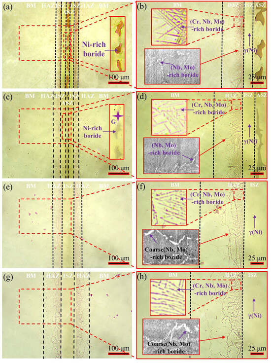 Microstructure and heat-affected zone of GH4169 joints at different brazing temperatures: (a) 1030 °C; (c) 1060 °C; (e) 1090 °C; (g) 1120 °C; (b,d,f,h) correspond to the enlarged views at the dashed boxes in (a,c,e,g), respectively.