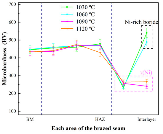 Microhardness distributions of the joint directly reflect the inherent connection between the microstructure and mechanical properties of the joints. Figure 9 shows the microhardness distributions of joints at different brazing temperatures. When brazed at 1030 °C and 1060 °C, the joint microstructure is composed of the ASZ, ISZ, and HAZ. The existence of brittle phases, such as the eutectic structure and borides, led to the microhardness of the ASZ and HAZ being high. When the temperature was increased to 1090 °C and 1120 °C, the ASZ was eliminated, and the microhardness of the ISZ increased compared with the ISZ of the joint at low temperatures. Binesh et al. [33] found that the high microhardness of the BM was caused by the existence of the γ′ strengthening phase and the solid solution strengthening effect, and sufficient diffusion of solution strengthening elements (Cr and Co) and γ′ strengthening elements (Al and Ti) at high temperatures resulted in the hardness increase in the ISZ. In addition, sufficient alloy element diffusion led to the hardness distributions in the ISZ at high temperatures, showing a small fluctuation, which reflects the more homogeneous microstructure.