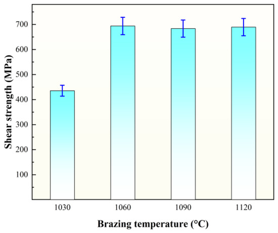 Figure 10 illustrates the effect of brazing temperatures on the shear strength of joints. At 1030 °C, the shear strength of the joint is 435.54 ± 13.06 MPa. At 1060 °C, the shear strength arrived at the maximum value (693.78 ± 20.81 MPa), because the volume fraction of Ni-based solid solution increased, which could alleviate the stress concentration caused by brittle phases. When the temperature is 1090 °C, the shear strength slightly decreases to 683.42 ± 20.50 MPa. At 1120 °C, the shear strength is 689.33 ± 18.67 MPa.