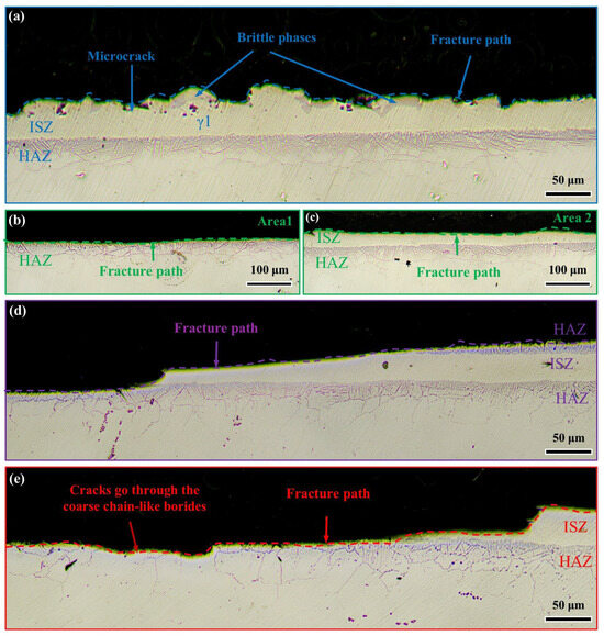 Fracture paths of joints at different brazing temperatures: (a) 1030 °C; (b,c) 1060 °C; (d) 1090 °C; (e) 1120 °C.