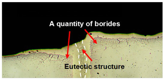 Figure 11 shows the fracture path of joints at different brazing temperatures. At 1030 °C, the fracture path is in the ASZ, which means that the ASZ is the weakest area of the joint. It could be found that cracks occupy the brittle phase. This phenomenon is similar to other research: the brittle phase results in the stress concentration in the ASZ and provides a preferentially low resistance path for the initiation and propagation of cracks [34]. Further increasing the temperature to 1060 °C, the joint ruptured through the ASZ and HAZ because the volume fraction decreased in the brittle phase and the volume fraction increased in borides in the HAZ. The morphology of the brazed seam ends at 1060 °C is depicted in Figure 12. It can be observed that a large amount of brittle phase is distributed at the end of the brazed seam, indicating that the brittle phase deteriorates the mechanical properties of the joint. At 1090 °C and 1120 °C, the fracture path is mainly in the HAZ and ISZ. The borides in the HAZ become coarser, as shown in Figure 8. Therefore, the crack extends through the coarse borides in Figure 11e, indicating that the coarse borides in the HAZ reduce the shear strength of the joint.