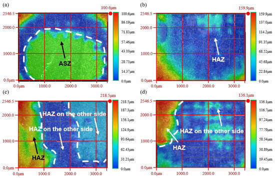 Figure 13 shows the fracture morphology of the joints at different brazing temperatures. At 1030 °C, the blue area was deduced as the fracture morphology in the ASZ combined with the conclusion of the fracture path above. At 1060 °C, the roughness range was mainly in the low area, and the tendency of the joint dropped quickly from the bottom left and then plateaued. Hence, combined with the analysis above, it could be inferred that a few cracks happened at the end of the brazed seam, and partial cracks went through the brazed seam and spread along the HAZ because of the existence of many borides in the HAZ [35]. At 1090 °C and 1120 °C, the fracture morphology also shows that fracture behaviors happened in the HAZ. Namely, the HAZ of joints at high temperatures is the weak area under the external force, and cracks propagate quickly in this area.