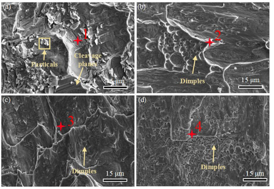 Figure 14 shows the fracture morphology of joints brazed at different temperatures (SEM), and Table 3 demonstrates the EDS results of these fractures. At 1030 °C, the fracture mode was considered as the quasi-cleavage fracture due to the fracture characteristics, such as cleavages and dimples. The EDS results show that the fracture is in the ASZ. At 1060 °C, 1090 °C, and 1120 °C, these joints all fractured in a ductile mode according to a mass of dimples. The EDS results indicate that the fractures of these joints at high temperatures are in the HAZ, which is consistent with the conclusion above.