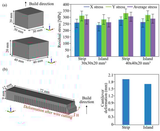 - The residual stress was reduced by 5.47–8.41% and the thermal deformation of the cantilever by 8.33% compared to the strip process by applying an island pattern with a hatching length of 5 mm.
