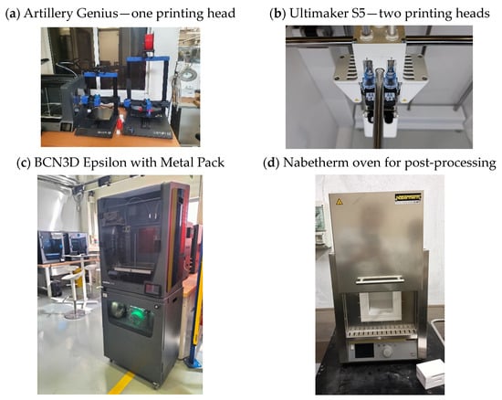 Material extrusion equipment: (a) mono-extruder open-frame equipment, (b) multiple-extruder closed-frame equipment, (c) equipment for metal compound AM, and (d) oven post-processing of metal parts. Source: Laboratory of Manufacturing Technologies of ETSEIB and Fundació Privada Centre CIM.