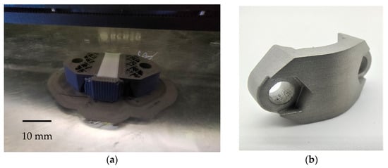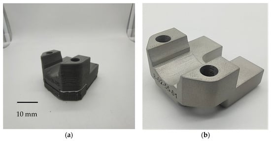 Metallic material extrusion part: (a) while being printed and (b) after being processed via debinding and sintering. Reprinted with permission from Ref. [56]. Diseño y Fabricación de Maquinaria para Alimentación S.L. (DIFMAC ROURE), Santa Perpètua de Mogoda, Spain, is the owner of the parts.