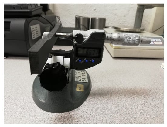 The dimensional accuracy of indirect FFF/FDM metal manufacturing via 3D printing of metal and binder composites plus post-processing treatments to remove the binder, such as washing and sintering in the case of SS 17-4 PH, is reported to reach ISO IT13 grades [66]. Also, in the general case, it has been reported that the dimensional surface deviations in FFF/FDM can be formulated as a function of the layer thickness and deposition angle selected in the process parameters [67]. Reportedly, some of the most common causes of errors in material extrusion processes are thermal warping and shrinkage [68]. In copper-filled PLA parts, Buj-Corral and Sivatte-Adroer [69] reported dimensional error values up to 5.8% in the X direction, and lower dimensional error values up to 3.5% in the Z direction. In steel-filled PLA parts, dimensional relative errors between 1% and 9% were reported in prismatic and bone-shaped specimens [70]. Figure 4 shows the dimensional measurement of a steel-filled dogbone specimen with a Mitutoyo micrometer.