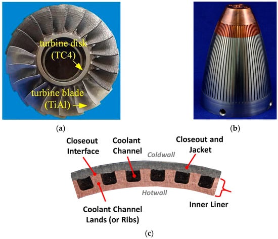 Bimetallic structures for the aerospace industry: (a) Bimetallic Ti-6Al-4V/Ti-48Al-2Cr-2Nb (TC4/TiAl) aircraft turbine blades manufactured by laser additive manufacturing methods (reprinted with permission from ref. [33]. Copyright 2020, Materials Letters, Elsevier); (b) axial liner for the rocket nozzle (reprinted with permission from ref. [36]. Copyright 2020, Acta Astronautica, Elsevier); (c) structure of a bimetallic liner in the cooling wall of a rocket nozzle (reprinted with permission from ref. [36]. Copyright 2020, Acta Astronautica, Elsevier).