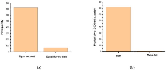 Comparison of economic parameters of MIM and Metal-ME technologies depending on produced parts quantity: (a) parts quantities when net cost and dummy time of MIM and Metal-ME become equal; (b) productivity of MIM and Metal-ME when parts quantity is 2000 (adapted from ref. [43]).