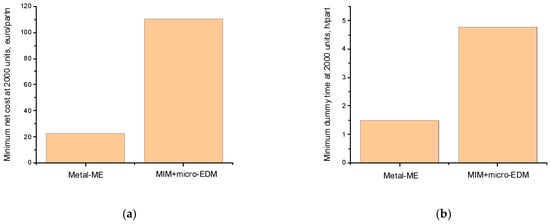 Comparison of economic parameters for manufacturing turbine blades using MIM technology followed by micro-EDM technology, and Metal-ME technology: (a) minimum net cost at 2000 units; (b) minimum dummy time at 2000 units (adapted from ref. [43]).