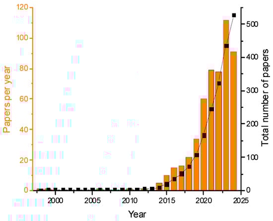The benefits of using Metal-ME technologies are attracting great interest from researchers and developers. The number of publications on extrusion 3D printing of metal products is actively growing (Figure 7).