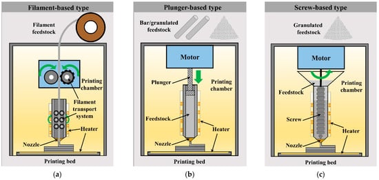 Main types of extrusion-based 3D printing of metal products: (a) FDM-based; (b) plunger-based; (c) screw-based (reprinted from ref. [42]).