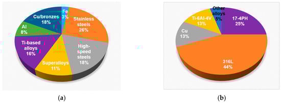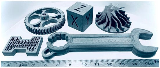 Researchers often use commercially available filaments, while some filaments are practically not covered in the papers. In published scientific papers, the most widespread filaments are filled with structural alloys, such as stainless steels 17-4 PH [54,66,67,68,69] and 316L [66,67,68,69,70,71,72,73,74,75,76,77,78,79,80], Ti-based alloys [81,82,83], and Cu [55,56,84,85,86]. The production of functional materials such as hard magnetic Nd-Fe-B alloys and soft magnetic carbonyl iron, ferrites, and so on, using Metal-ME technologies is also of scientific and practical interest [87,88]. In some cases, it is possible to eliminate the stages of debinding and sintering and to obtain the finished product directly after the 3D printing stage when using magnetic materials. This is a great advantage of the Metal-ME method for producing such materials.
