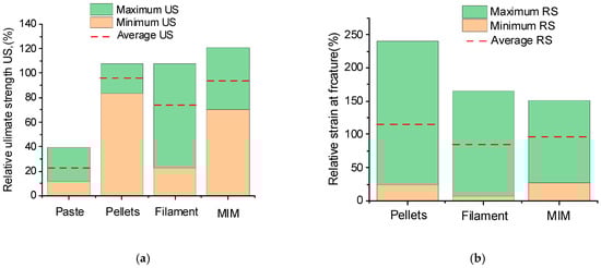 FDM-type techniques were initially developed for manufacturing polymer products [60,62]. However, in 1998, a patent [63] was first published showing the possibility of using this kind of AM technology to produce parts from a metal-polymer composite filament. At the moment, filament-based technologies are the most popular for the indirect production of metal products. Approximately 80% of all papers on extrusion-based 3D printing of metal products are devoted to them, and only about 20% are devoted to plunger-based and screw-based technologies using granules and pellets [47]. Plenty of reviews are also devoted to the former [42,64]. Figure 9 shows a diagram of currently commercially available composite filaments that can be found on official producers’ websites.