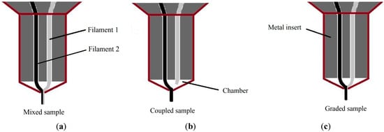 Multi-material gradient structures can have a unique set of characteristics, including mechanical, optical, magnetic, electrical, hydrodynamic, and so on. Traditionally, multi-material structures are produced by connecting individual elements from different materials using detachable and permanent fasteners. The latter is also used for the production of bimetals, which are a solid semi-finished product consisting of two dissimilar metallic materials. Conventional methods for producing bimetals are various types of welding, including explosion welding, laser butt welding, friction stir welding [3,4,5,6], soldering, cladding, co-extrusion of metal blanks [7,8], and some others. In addition to the relatively simple shape of the semi-finished products obtained by these methods, a significant problem is the zone of connection of dissimilar metals, which limits the properties of the structure as a whole.