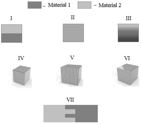 Multi-material structures can combine various mechanical, chemical, electrical, thermal, magnetic, and optical properties, they can also simultaneously possess corrosion resistance, wear resistance, impact strength, etc., provided by each of its materials. Multi-material additive manufacturing (MMAM) opens wide perspectives in the production of functionally graded materials (FGM), in which each section has its own chemical composition and performs a specific function [10]. When using MMAM, it is possible to manufacture predetermined local places in the structure from the desired material with high precision which can help to essentially improve the performance of the entire structure by utilizing materials and their properties more effectively. Due to these advantages, MMAM has proven to be an extremely important option for the production of multifunctional products [11].