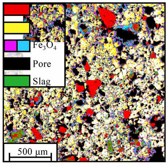 The mineral phase structure of the pellets is shown in Figure 1. As seen in Figure 1, the hematite (Fe2O3) crystals in the pellets are well-formed, with high intergranular bonding. The internal porosity of the pellets is relatively rounded, and SiO2 is predominantly present as plate-like inclusions between the hematite crystals.