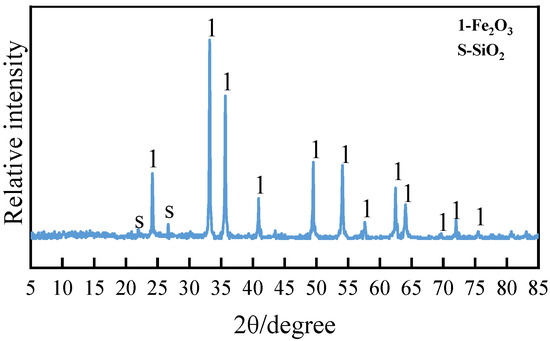The X-ray diffraction (XRD) phase composition of the pellets is shown in Figure 2. As observed in the figure, the XRD phase composition is primarily composed of Fe2O3 and SiO2.