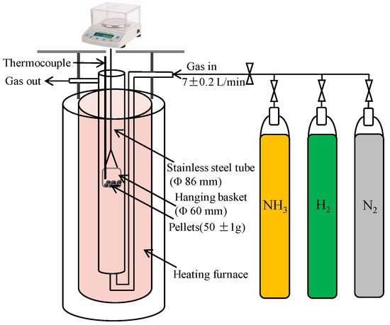 The experimental device for NH3–H2 reduction of pellets is shown in Figure 3. The pressure condition of the reaction is 1atm. The reaction device is composed of a gas flow controller, a tubular reaction bed, and a weighing device. For each experimental condition, 50 ± 1 g of pellets (25 ± 1 pellets) were placed in a hanging basket with a diameter of 60 mm. The basket was suspended from the bottom of a balance (accuracy: ±0.001 g) and positioned inside a reaction tube with a diameter of 86 mm. Prior to the reaction, nitrogen gas was introduced into the system at a flow rate of 7 ± 0.2 L/min to serve as a protective gas. The reaction tube is heated at a rate of 10 °C/min to the specified thermocouple holding temperature setting value (700, 750, 800, 850 °C), the temperature is kept unchanged, nitrogen is replaced by pure reaction gas into the reaction bed at a flow rate of 7 ± 0.2 L/min, and the weight loss is recorded. The gas composition conditions of the NH3–H2 reduction reaction of the pellets are shown in Table 2. After the reduction reaction is completed, the introduction of reaction gas is stopped, nitrogen is continuously injected until the temperature of the reaction tube is cooled below 100 °C, and the pellet is removed to detect its chemical composition and microstructure.