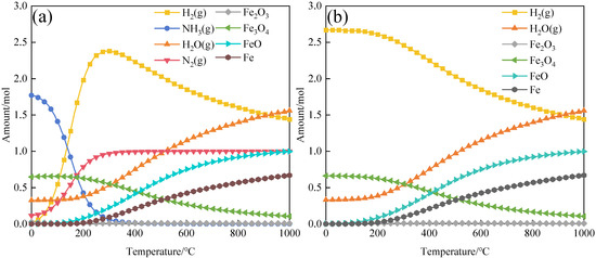 Using the HSC Chemistry 6.0 Equilibrium Compositions module, it is calculated that in the temperature range of 0–1000 °C, under 1 atm, the change of substance quantity during the reaction of 2 mol of NH3 and 1 mol of Fe2O3 and 3 mol of H2 and 1 mol of Fe2O3 is shown in Figure 4. The calculation results show that the increase in temperature will increase the decomposition equilibrium conversion of NH3 and promote the increase of H2 and N2 contents. The decomposition of two moles of NH3 to three moles of H2 and one mole of N2, at 400 °C, 1 atm, two moles of NH3 can reach 99% equilibrium decomposition and transformation. For the reduction of 1 mol Fe2O3 by 2 mol NH3 and 3 mol H2, the thermodynamic equilibrium phase composition is basically equal at temperatures greater than 260 °C.