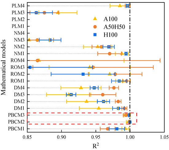Common mathematical models describing gas-solid reactions summarized by Daniel Spreitzer et al. [22] were used to select the most probable mechanism function. There are Phaseboundary-controlled models (PBCM), Diffusion models (DM) and Reaction order models (ROM), Nucleation models (NM), and Power-law models (PLM). The most probable mechanism function was selected by comparing the four temperatures under different atmosphere and reaction models with linear fitting R2 average values, and the results were shown in Figure 8.