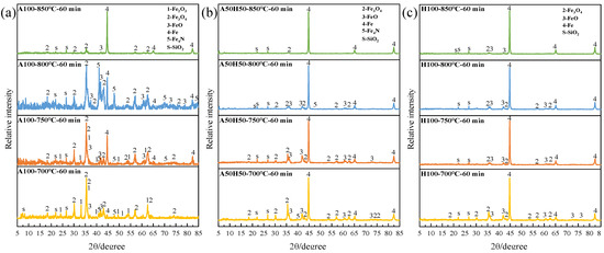 Panel (a): The phase structure composition of pellets after 60 min of reduction under different temperatures in A100. Panel (b): The phase structure composition of pellets after 60 min of reduction under different temperatures in A50H50. Panel (c): The phase structure composition of pellets after 60 min of reduction under different temperatures in H100.