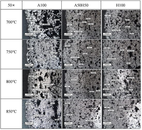 The structure of the reduced iron layer of pellets at different temperatures and in different reducing atmospheres is shown in Figure 12. There is always a multi-phase coexistence structure in the reduced iron layer, and there is a large reduction-state gradient inside the pellets. At 700 °C and 60 min of A100 reduction, the reducibility index of pellets is 37.06%, and FeO is not obviously formed. Due to the structural difference between Fe2O3 and Fe3O4 crystal forms, a loose porous structure is formed inside the pellets after grinding and polishing. With the increase of reduction temperature within 60 min of A100 reduction, the content of Fe phase and FeO phase in the reduced iron layer inside the pellets increases and the reduction of Fe2O3 is completed. The internal structure of the pellet is more stable. After the reduction of A50H50 and H100 at 850 °C for 60 min, the internal mineral phase structure of the pellets is similar, which is consistent with the XRD results.