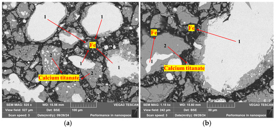 SEM-EDS analysis was conducted on the roasted products under the optimal calcination conditions: 60 w.t.% CaCO3, reduction temperature of 1400 °C, and reduction time of 120 min. The results are shown in Figure 9. The EDS analysis indicated that the brighter particles (point 1) corresponded to metallic iron, whereas the darker particles (point 2) were identified as calcium titanate. The SEM results indicated that under the optimal roasting conditions, large metallic iron particles formed in the reduction products, with particle sizes reaching approximately 100 μm. It was evident that the addition of CaCO3 in the carbothermic reduction of ilmenite can promote the aggregation and growth of metallic iron particles. Additionally, the separation between metallic iron and calcium titanate was distinct and with large particles and clear boundaries, which were beneficial for the subsequent magnetic separation. Furthermore, the energy spectrum analysis in Figure 9 reveals that the reduction products contain only the constituent elements of the metallic iron and calcium titanate particles, with no impurity elements detected, indicating that the purity of these two reduction particles is high.