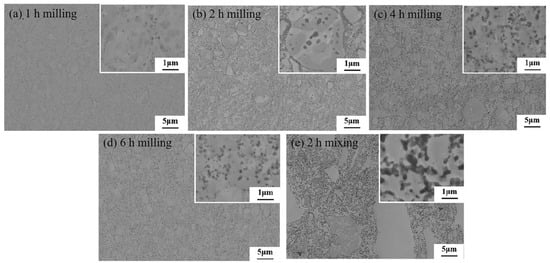 Compared with MS1, the particle fragmentation of MS2 is larger, and TiB2 particles are more evenly dispersed in the collective. Thus, with the further increase in milling times, the likelihood and extent of TiB2 embedding continue to rise. Figure 1c,d show that the amount of embedded TiB2 reaches its limit after MA for 4 and 6 h. At this point, any remaining nano-TiB2 particles are distributed on the surface of the HEA powders, leading to a decline in mechanical properties, as illustrated in Figure 3. Figure 1e shows the SEM image of the AlCoCrFeNi2.1 and 5 vol.% TiB2 composite subjected to 2 h of low-speed mixing and subsequently consolidated by SPS (BS2). It is observed that TiB2 particles decompose in the matrix after sintering, with an intense interfacial reaction between TiB2 and the matrix. Low-speed mixing resulted in unrefined TiB2 flake particles remaining between the two phases, negatively impacting the mechanical performance of the HEA composite.
