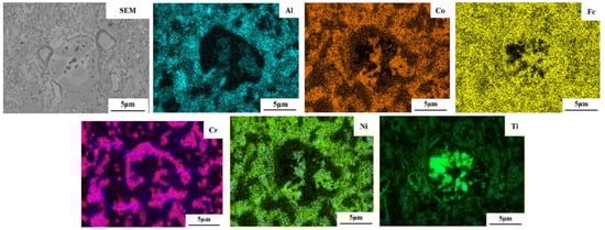 Figure 1a–d show the SEM morphologies of the AlCoCrFeNi2.1 and 5 vol.% TiB2 composite bulks. As shown in Figure 1a, the interface between the matrix and the reinforcement particles of MS1 is relatively clean, with the refined TiB2 particles well dispersed between the two phases. This clean interface facilitates efficient load transfer, allowing the reinforcement to strengthen the matrix under external forces, which ultimately improves the matrix strength. As the milling time reaches 2 h (Figure 1b), the matrix and reinforcement particles are further fragmented. As seen in the EDS mapping in Figure 2, TiB2 not only appears in the gap of AlCoCrFeNi2.1 HEA, but is also embedded in the FCC and BCC phases. During MA, the TiB2 powders and the steel balls impact the alloy powder, causing some TiB2 to embed in the HEA powders while other TiB2 particles attach to the surface. Additionally, the size of the HEA powders decreases under this impact, which is beneficial for the mechanical performance of the HEA composites.