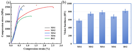 Room-temperature compression and hardness tests were conducted to investigate the effect of milling time on the mechanical properties of the HEA composites. The typical compression curve and Vickers hardness of the AlCoCrFeNi2.1 and 5 vol.% TiB2 composites are illustrated in Figure 3. Notably, MS2 exhibits excellent compressive properties, with a yield strength of 1510 MPa, fracture strength of 2500 MPa, plasticity of 2.5%, and a high hardness of 780 HV. The increase in milling time contributes to grain refinement, which enhances the interface bonding strength between the reinforcing phase and the matrix, increases lattice strain, and reduces internal defects [29,30]. However, excessive milling time leads to significant interface reactions and the introduction of numerous steel scrap impurities and hard oxides (Al₂O₃) [28,31], resulting in a sharp decline in the plasticity of the HEA composite and premature failure.