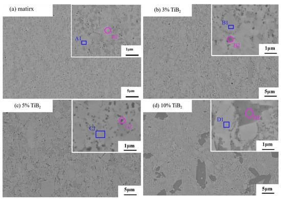 To understand the effect of TiB2 on the microstructural evolution and mechanical properties, a series of AlCoCrFeNi2.1 HEAs with varying TiB2 contents were prepared by MA and consolidated by SPS, and the morphology is shown in Figure 5. As shown in Figure 5a, the microstructure of the AlCoCrFeNi2.1 HEA matrix features large irregular regions and small dispersed areas. This variation is attributed to the high-frequency current during SPS, which induces different currents and localized heating, affecting the grain growth rate in various regions. Notably, the AlCoCrFeNi2.1 HEA exhibits no macroscopic defects on its surface and is relatively dense. Figure 5b displays the morphology of the composite with 3 vol.% TiB2 particles, revealing that the circular and oval TiB2 particles are uniformly distributed within the matrix. During the MA process, the rapid crushing of TiB2 particles and the matrix generates numerous fresh surfaces. The clean interfaces between the TiB2 particles and the matrix enhance bonding, thereby improving the mechanical properties of the composite. As the volume fraction of TiB2 increases to 5% (Figure 5c), the spacing between the particles decreases significantly, indicating a denser distribution of ceramic particles throughout the matrix, resulting in a more uniform structure. The TiB2 particles exhibit a wide size range from microns to nanometers, which contributes to effective particle refinement—an essential factor for enhancing the overall performance of the composites. This range of sizes facilitates the formation of a complex three-dimensional network structure, which not only strengthens the bond between particles and the matrix but also effectively inhibits crack propagation. Figure 5d illustrates the morphology of the HEA composite with 10 vol.% TiB2 particles. However, due to the excessive TiB2 contents, the degree of decomposition increases, causing a blurring of the phase interface, which detracts from the enhancement in the matrix’s mechanical properties. The EDSs of A1, A2, B1, B2, C1, C2, D1, and D2 zones are presented in Table 1. It can be found that the A1 region is rich in Ni, Co, and Fe elements, while Cr and O elements are enriched in the A2 region in the matrix alloy. For the composite with 3 vol.% TiB2 particles, the B1 region is rich in Ni, Co, and Fe elements, and Cr, Ti, B, and O elements are enriched in the B2 region. Similarly, in the composite with 5 vol.% or 10 vol.% TiB2 particles, C1 and D1 regions are rich in Ni, Co, and Fe elements but Cr, Ti, B, and O elements are enriched in the C2 and D2 regions. The above results illustrate that the matrix contains a Ni-Co-Fe-enriched FCC and Cr-Al-enriched BCC matrix phase, plus a minor amount of Cr-oxides. These composites with TiB2 particles include the matrix phase and Cr-Ti-B-enriched phase.