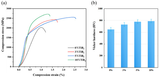 Mechanical performance. Compressive stress–strain curves (a) and hardness (b) of the AlCoCrFeNi2.1 HEA matrix with different TiB2 volume fractions.