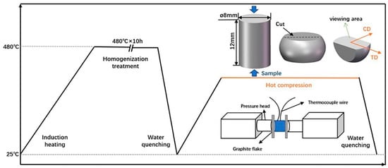 With the use of athermal simulation test machine (Gleeble-3800, DSI, NY, USA), a thermal compression test was conducted. After undergoing a solution treatment, the ZW305K magnesium alloy was transformed through wire cutting into a cylindrical sample measuring Ø8 × 12 mm. Before the experiment, the surface of the specimen was polished clean with sandpaper, and then a heating resistance wire was welded onto the cylindrical surface of the specimen. To reduce some uneven deformations of the sample caused by friction factors and the occurrence of severe deformation, graphite lubricant was evenly applied at the contact position between the indenter and both ends of the sample before the experiment to reduce friction. Finally, the sample was installed on the thermal simulation testing machine device, and the resistance wire was connected. Thermal compression deformations were performed at temperatures of 300 °C, 350 °C, 400 °C, and 450 °C, with strain rates of 0.01 s−1, 0.1 s−1, and 1 s−1. The strain was set at 0.5. Prior to compression, the sample was heated at a rate of 10 °C/s. Upon reaching the compression temperature, a 3 min warm-holding period was conducted. Immediate water quenching was performed post thermal deformation to maintain the microstructure. The thermal compression process illustration can be referred to in Figure 1.