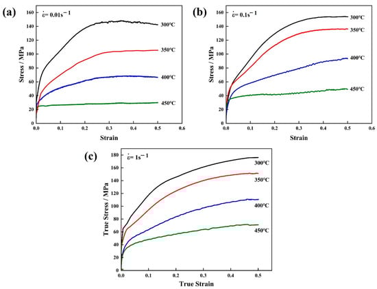 True stress–strain curves of ZW305K at various temperatures with different strain rates: (a) 0.01 s−1; (b) 0.1 s−1; (c) 1 s−1.