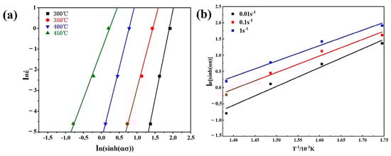 Linear relationship fitting: (a) ln − ln[sinh(ασ)]; (b) ln[sinh(ασ)] − 1/T.