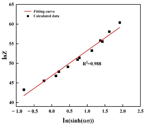 The Z value can be obtained by bringing in different deformation parameters and thermal deformation activation energy through Equation (10). A linear regression analysis was performed on the relationship between lnZ and ln [sinh(ασ)], as illustrated in Figure 6. Through fitting the slope of the line, the stress exponent n is determined to be 6.79, and the material constant A is obtained as 1.42 × 1020 from the intercept of the line. It can be seen from Figure 6 that the fitting coefficient reaches 98.8%, indicating that the hyperbolic sine constitutive equation accurately predicts the deformation behavior of ZW305K.