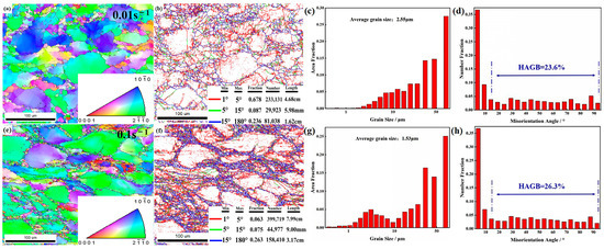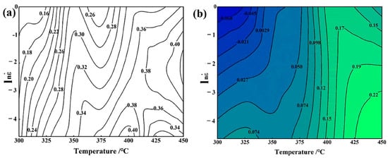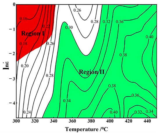 - Based on the hot processing map, material instability primarily occurs at low temperatures and high strain rates. An increase in temperature or a decrease in strain rate is conducive to the occurrence of dynamic recrystallization, leading to improved processability of the material. The optimal processing range is 400 °C at 0.01 s−1 and 450 °C at 0.1 s−1.