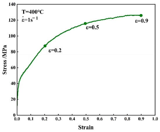 The true stress–strain curve with a strain rate of 1 s−1, a deformation temperature of 400 °C, and a strain of 0.9.