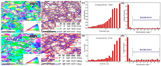 EBSD results of ZW305K magnesium alloy at 350 °C (a–d) and 400° C (e–h) with strain rate of 1 s−1: (a,e) IPF maps; (b,f) grain boundary images; (c,g) grain size distribution diagrams; (d,h) orientation difference angle distribution diagrams.
